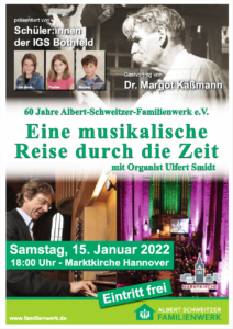 Am 15. Januar 2022 hieß es wieder „Augen und Ohren auf für Albert Schweitzer“. Das Konzert mit Lesungen und Vorträgen anlässlich des 60. Geburtstages des Albert-Schweitzer-Familienwerkes fand traditionell in der Marktkirche statt. Als Kooperationspartnerin sind wir zu einem festen Baustein dieses jährlich stattfindenden Ereignisses geworden. Es gab ein abwechslungsreiches Programm von Orgelstücken, unterhaltsamen Meilensteinen aus 60 Jahren Familienwerk, einem ergreifenden Referat von Frau Dr. Margot Käßmann und Geschichten aus verschiedenen Einrichtungen, gekonnt vorgetragen von den Gewinner*innen des Vorlesewettbewerbs der sechsten Klassen. In diesem Jahr waren das Pauline, Lilia Marie und Michael. Die Drei begeisterten das Publikum in der Marktkirche mit ihrer großen Lesefertigkeit und wurden mit lang anhaltendem Applaus belohnt.