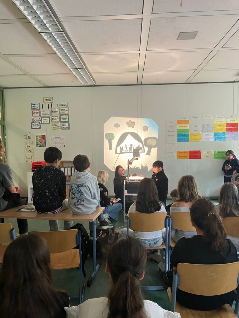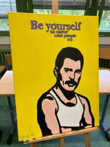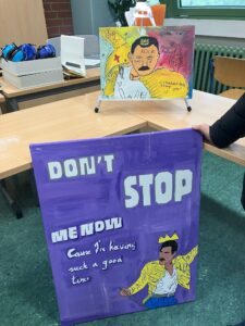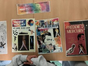 Was für ein fulminanter Auftakt in die gemeinsame Schulzeit! In der ersten gemeinsamen Projektwoche vom 22. bis 26. September 2025 widmete sich der fünfte Jahrgang seinem Namensgeber Freddie Mercury. Am ersten Tag durchliefen die Klassen noch im Klassenverbund die Lebensstationen Mercurys. An den 3 Folgetagen arbeiteten die Schüler*innen klassenübergreifend in gewählten Workshops zu unterschiedlichen künstlerisch-kreativen Aspekten. Die Musik-Legende wurde auf digitalen Plakaten mittels Canva auf unseren Schulipads präsentiert und auf kleine und große Leinwände gebracht. Es entstand ein richtiger Freddie-Mercury-Escape-Room und es wurden Schattentheater zu seinem Leben und seinen Auftritten produziert und aufgeführt. Außerdem performte eine Musikgruppe den Song „We will rock you“ auf der Bühne und in der Gruppe „Tanz wie Freddie“ wurde eine eigene Choreografie entwickelt. Donnerstag präsentierten alle Gruppen im Forum und im Jahrgangsflur ihre tollen Ergebnisse voller Begeisterung und Stolz. Freitag fand die Projektwoche dann mit einem jahrgangsinternen „We are the Champions“-Sportfest in der Turnhalle ihren Höhepunkt, als zu Freddies Songs die Klassen in unterschiedlichen Disziplinen mit- und gegeneinander antraten. Nun werden die Erlebnisse in den Kulturtagebüchern festgehalten und bleiben eine schöne Erinnerung an das erste gemeinsame Schuljahr.